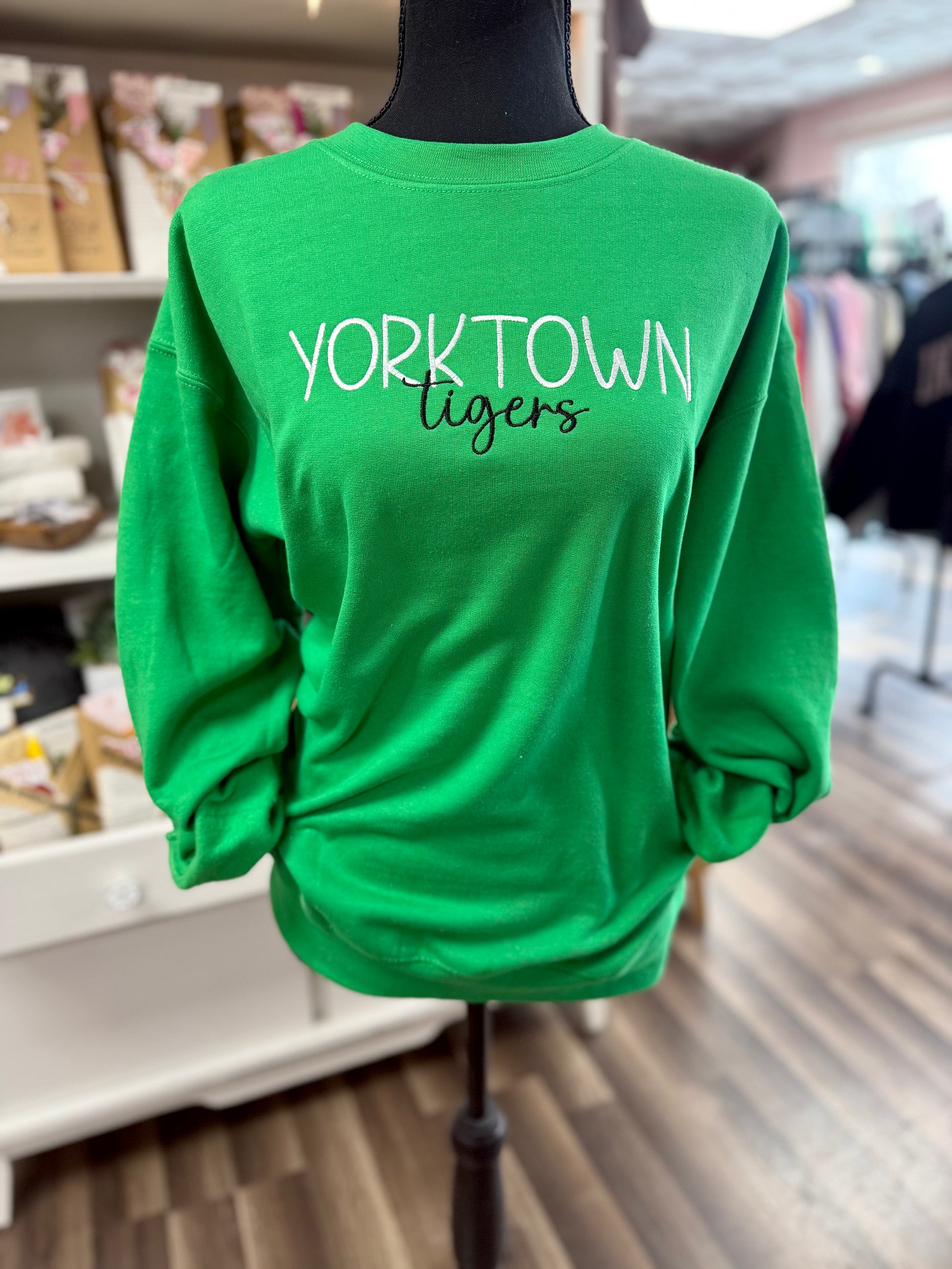 This Gildan basic crewneck sweatshirt is embroidered. Color shown is green and ash. Embroidered options are considered a pre-order at this time and will take a maximum of 10 days to complete.