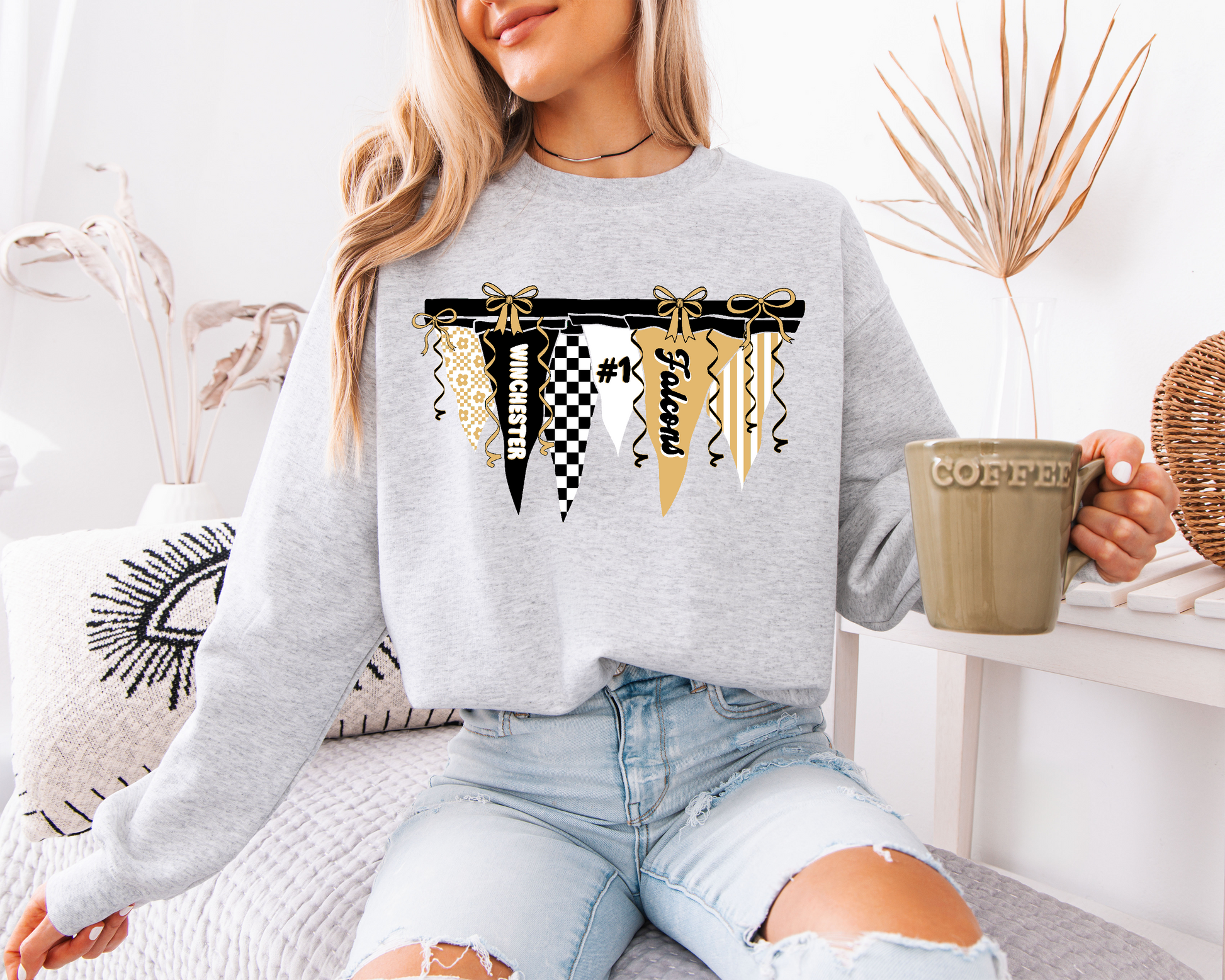 Item shown in ash Gildan crewneck. View product description here.