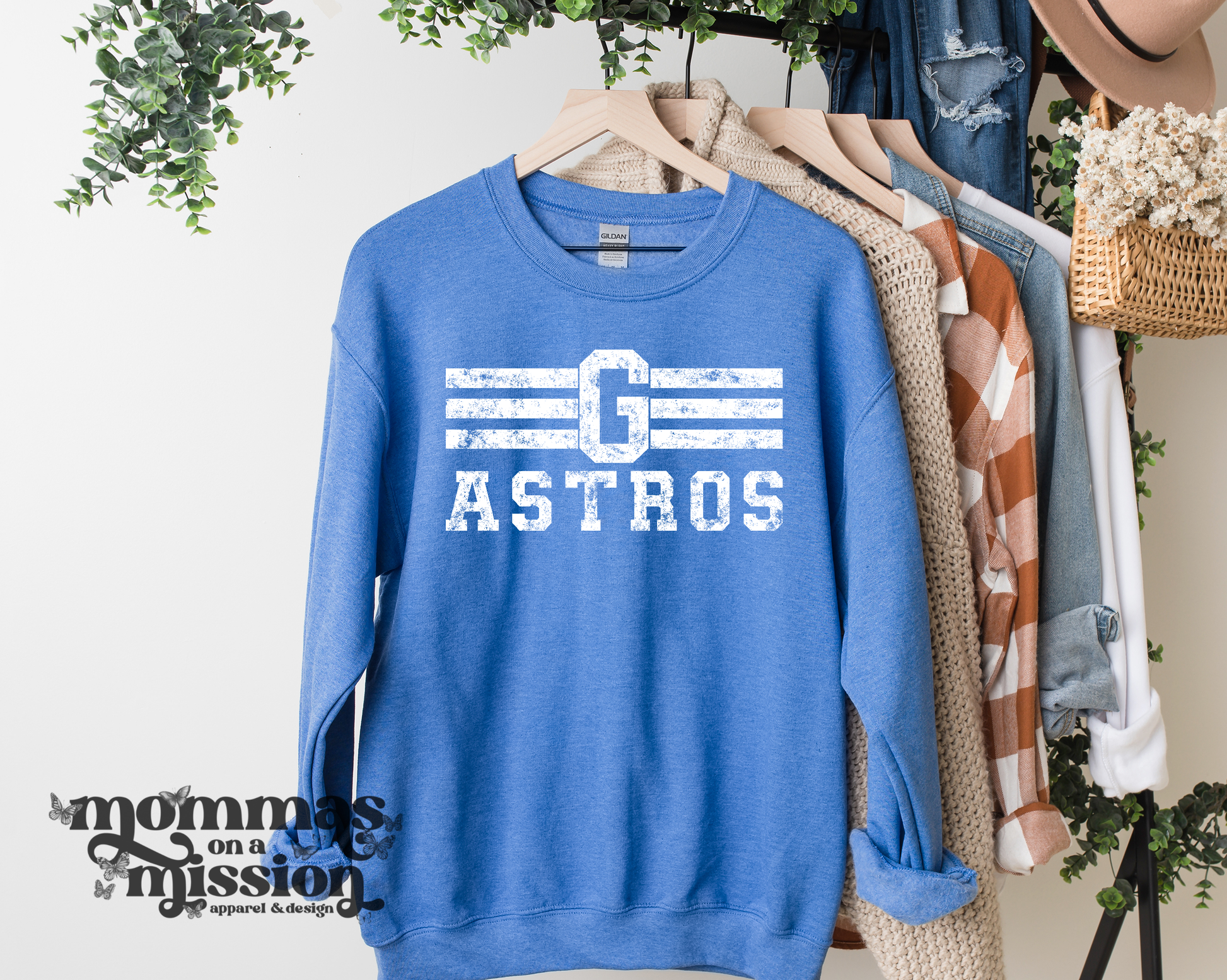 Item shown in heather sport royal Gildan crewneck. View product description here.