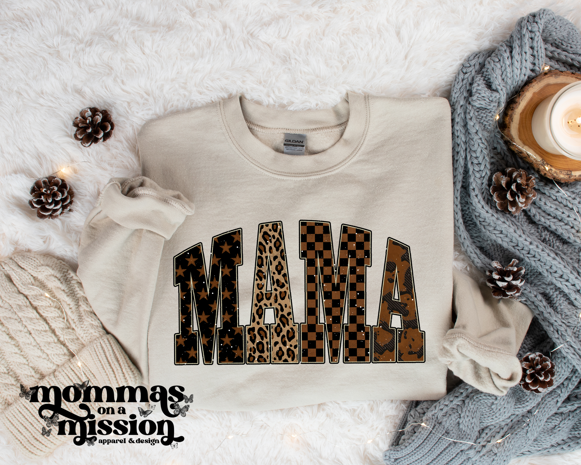 Item shown in sand Gildan crewneck. View product description here.