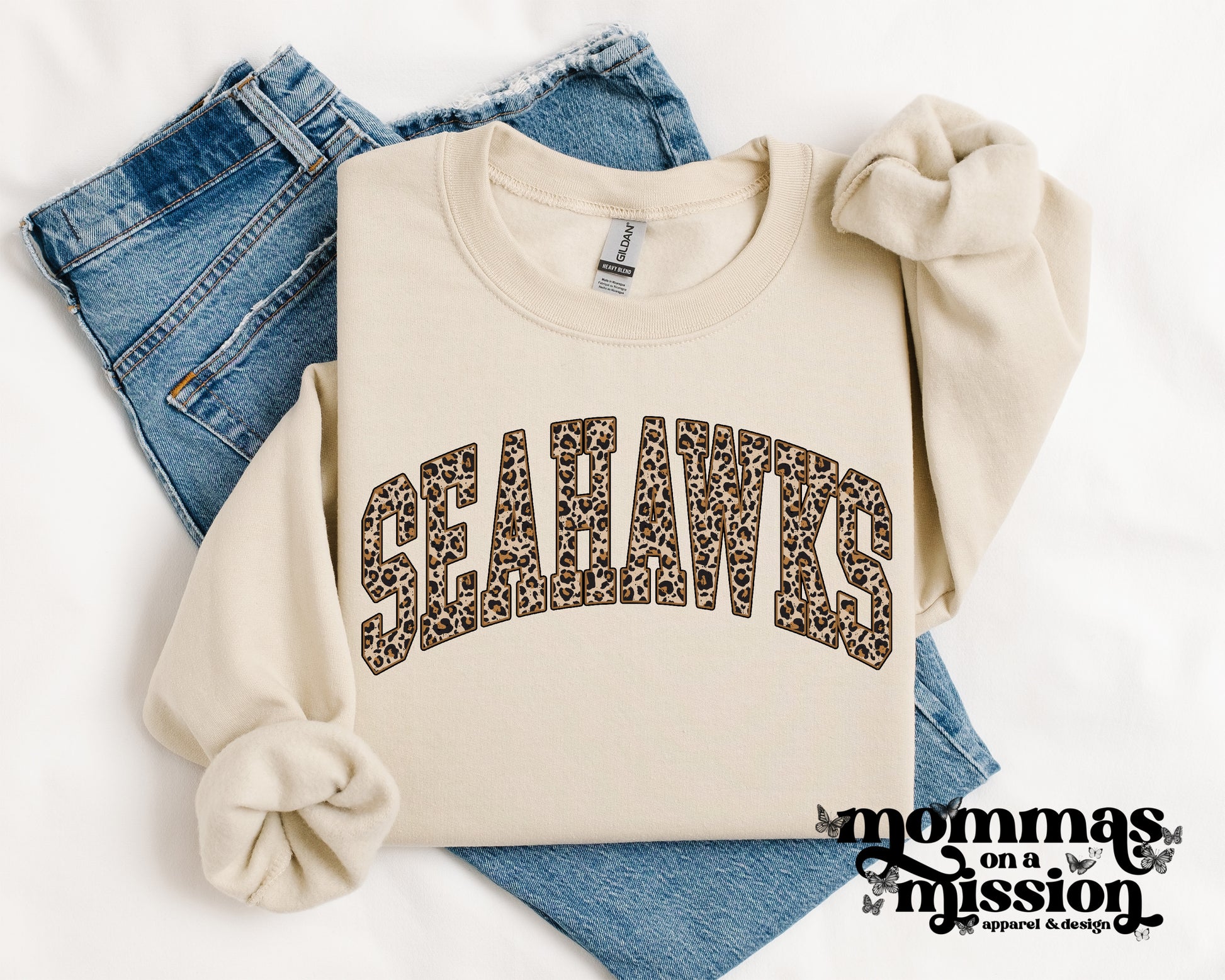 Item shown in sand Gildan crewneck. View product description here.